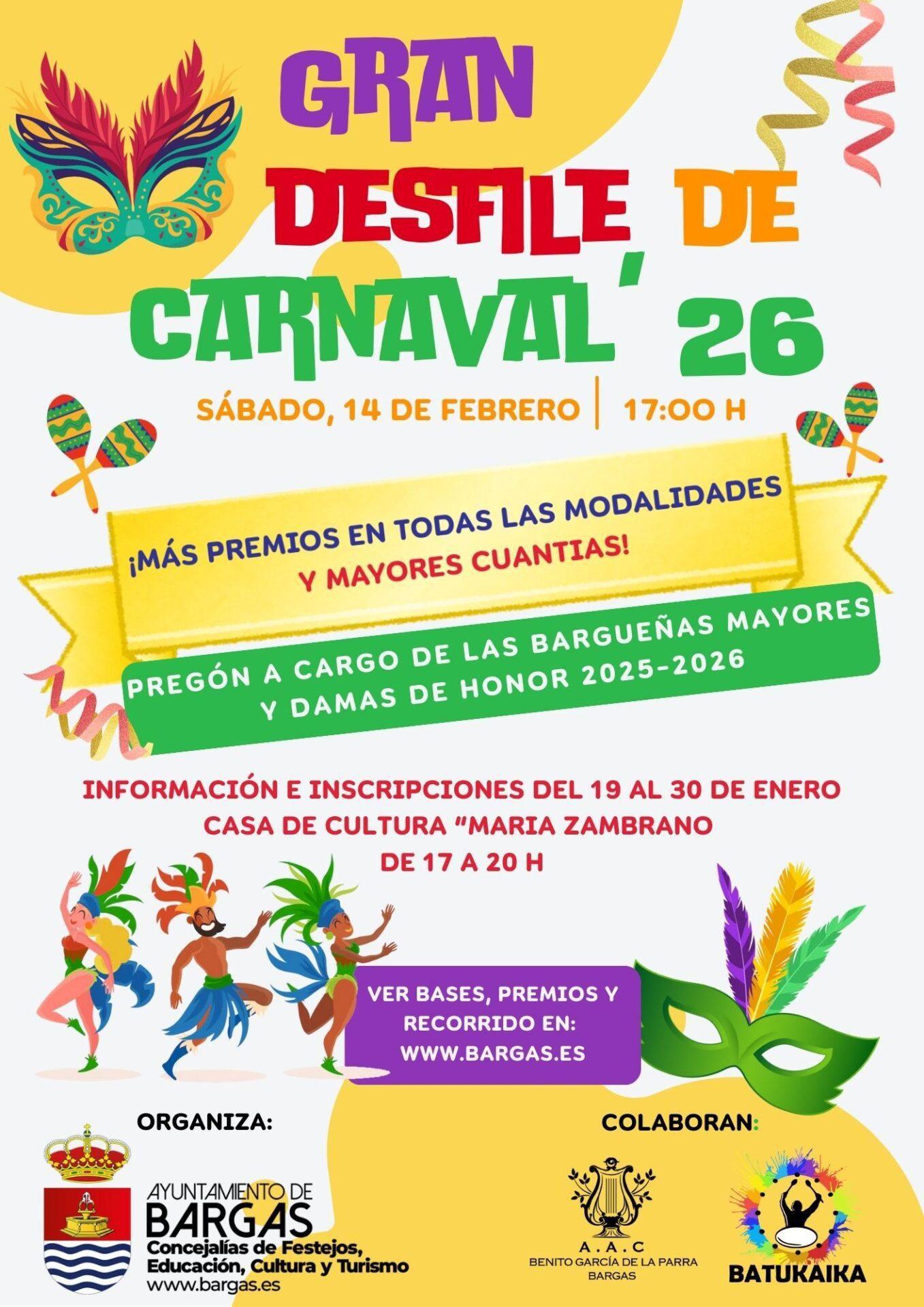 La programación comenzará hoy sábado a las 17:00 horas con el Gran Desfile de Carnaval, que contará con el pregón a cargo de las Bargueñas Mayores y Damas de Honor 2025-2026.