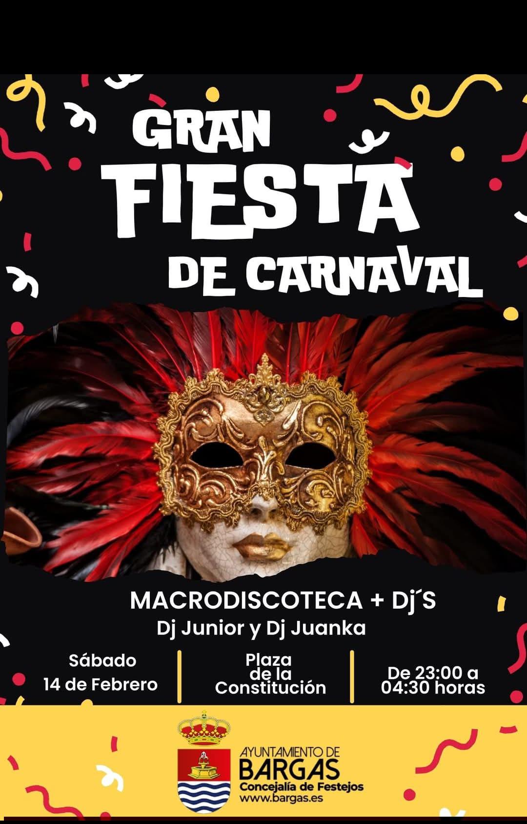 Por la noche, la celebración continuará con la Gran Fiesta de Carnaval, que tendrá lugar en la Plaza de la Constitución, con macrodiscoteca y DJ’s, en horario de 23:00 a 04:30 horas.
