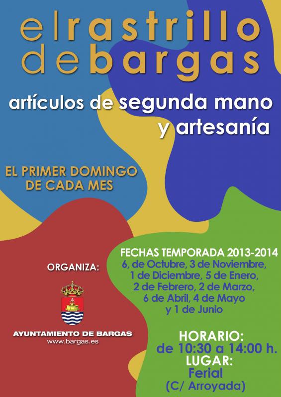 El Ayuntamiento de Bargas convoca a todos los participantes a la XX EDICIÓN DEL RASTRILLO DE BARGAS, que se celebrará el próximo DOMINGO, 3 DE NOVIEMBRE, en el Ferial de la calle Arroyada.HORARIO DE VENTA: de 10:30 a 14:00 h.